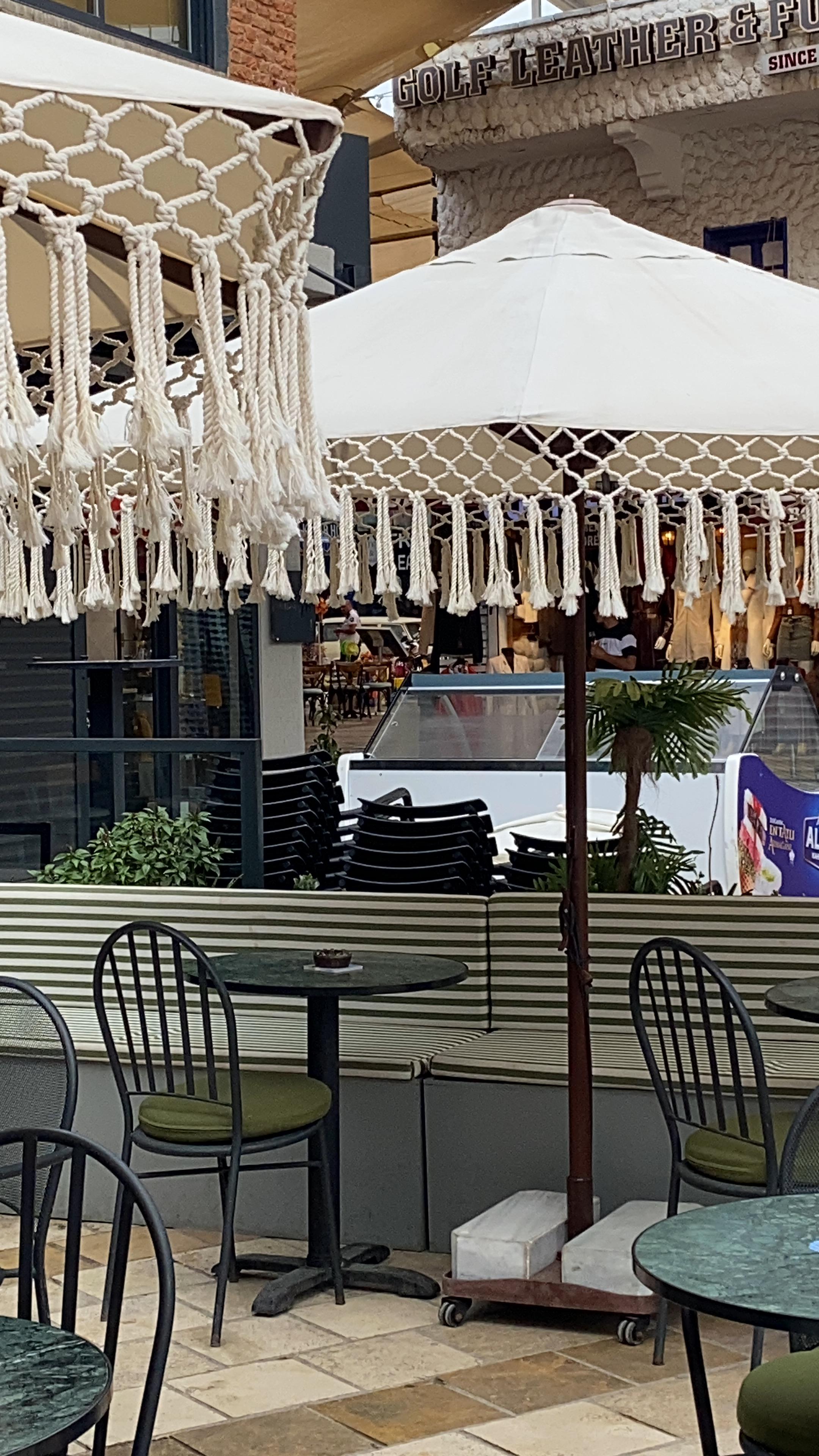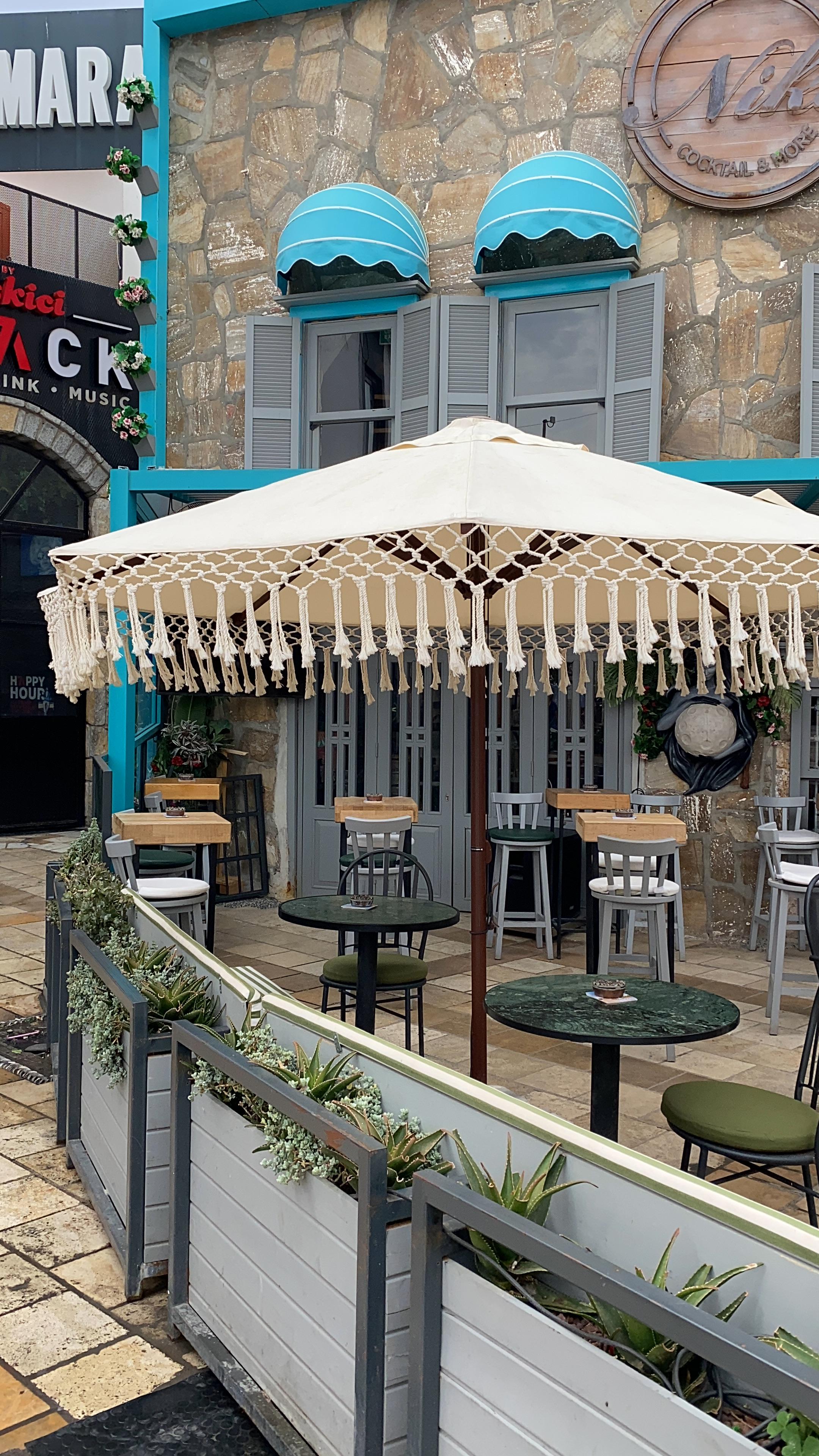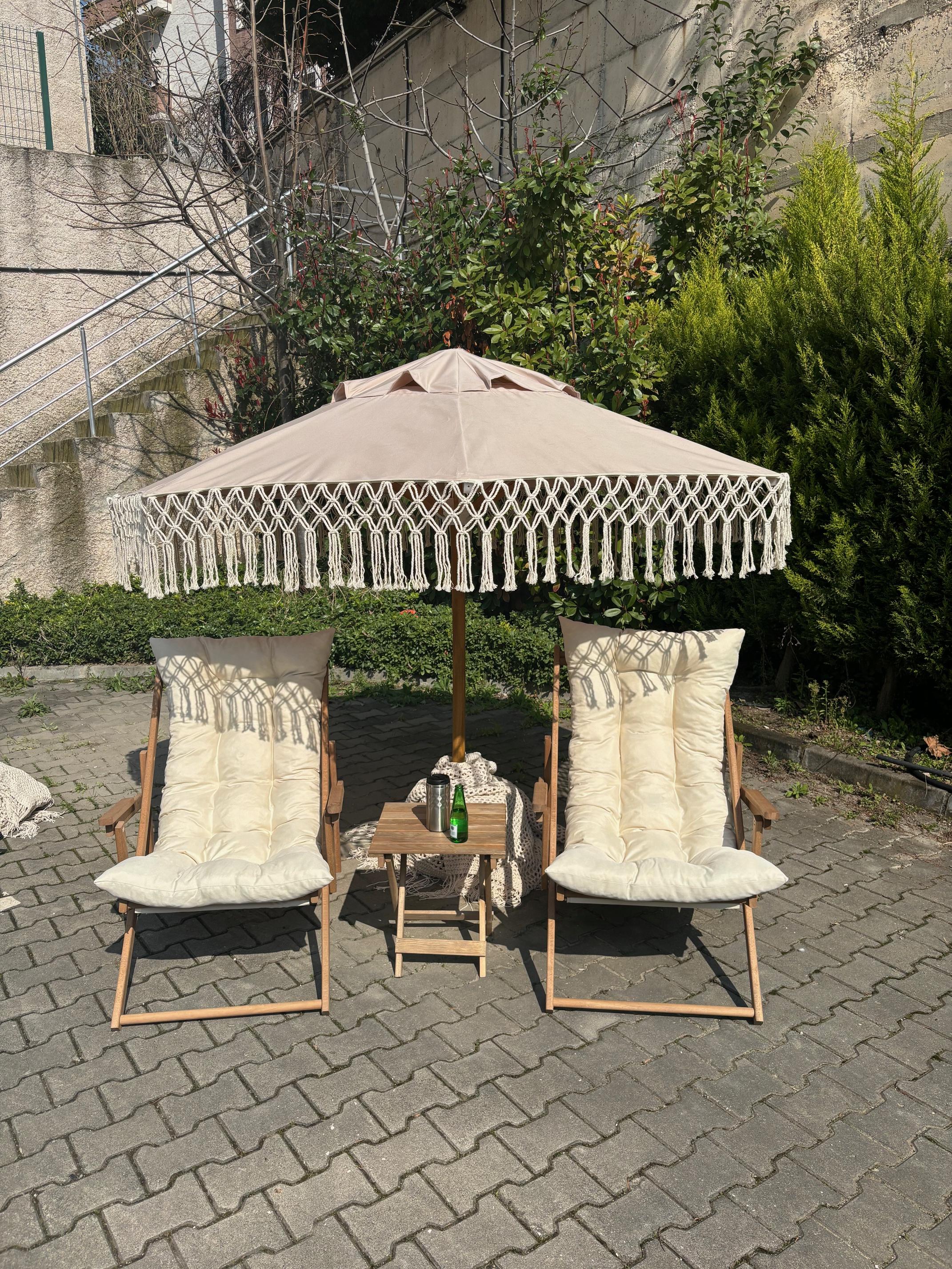 Şemsiye tentesi akrilik 1.sınıf ithal kumaş kullanılarak hazırlanmıştır. Şemsiye eteklerine %100 pamuk, 4 mm kalınlığında makrome ip kullanılarak elde hazırlanan saçaklar dikilerek, bohem bir görüntü oluşturulmuştur.