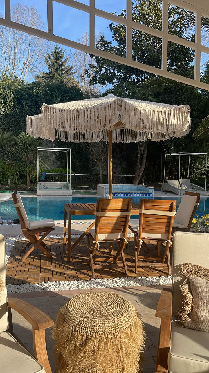 Görseldeki makrome şemsiyenin iskeleti ( gövde) kayın ağacından yapılmıştır. 250 cm çapında, 250 cm yüksekliğinde ve 8 kolludur. Fırınlanmış ve verniklidir. Her türlü dış mekan alanları için kullanıma uygundur.