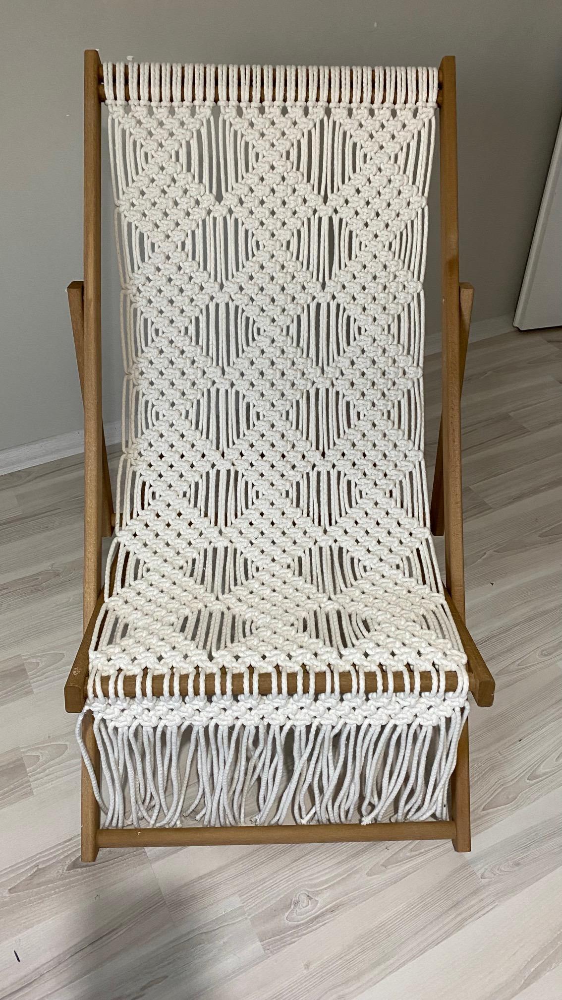 Görseldeki Makrome Şezlong / Sandalye iskeleti kayın ( gürgen ) ağacından yapılmıştır. 3 kademede oturma konforu sağlamaktadır. Oturum alanı; %100 pamuk, 5 mm kalınlığında dokuma makrome ip kullanılarak tamamen makrome tekniği ( düğümleme) ile hazırlanmıştır. Yaklaşık 130 kg.kadar taşıma kapasitesi vardır. Esneme yapmadan, uzun ömürlü bir konfor sunar.
