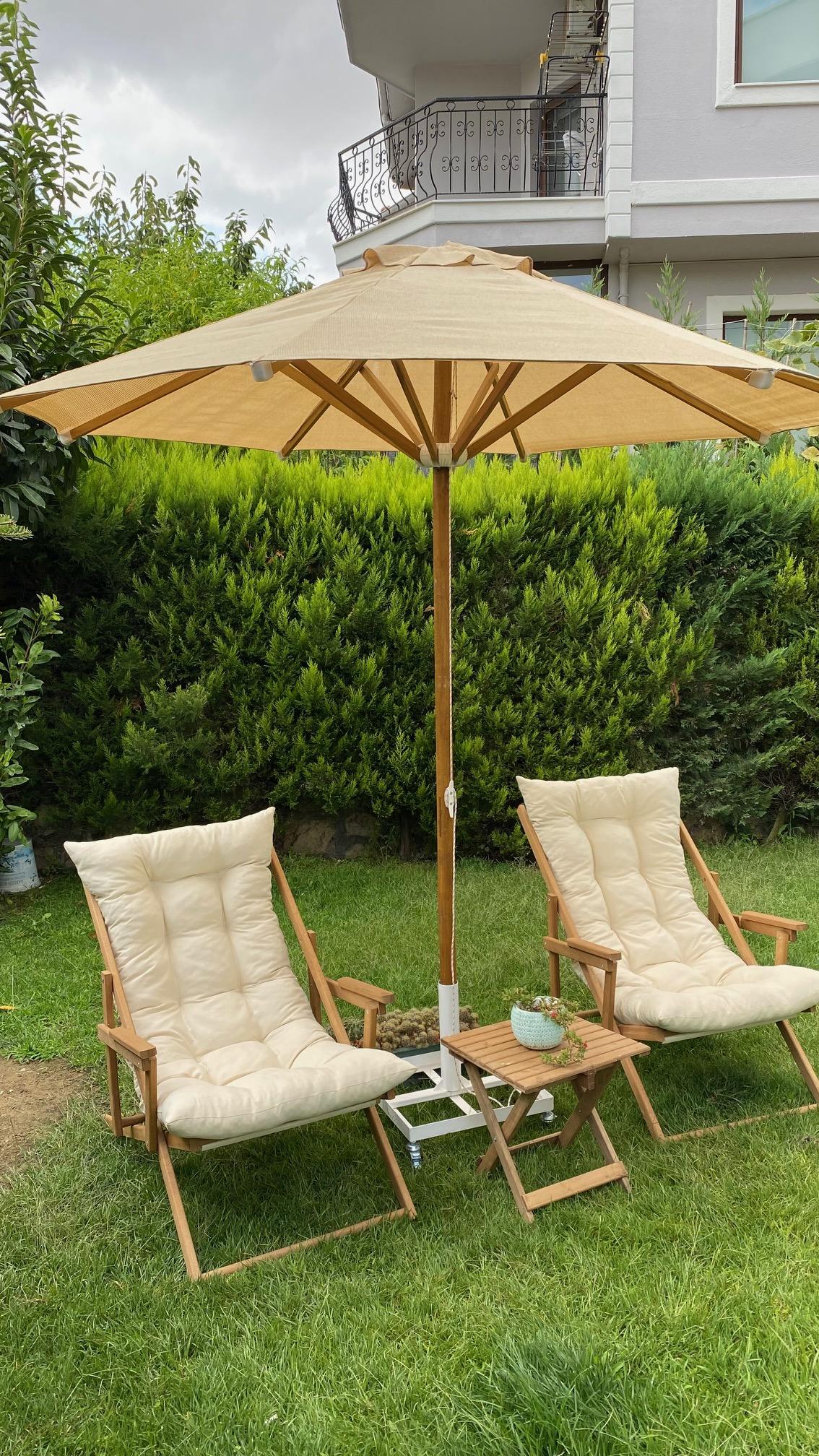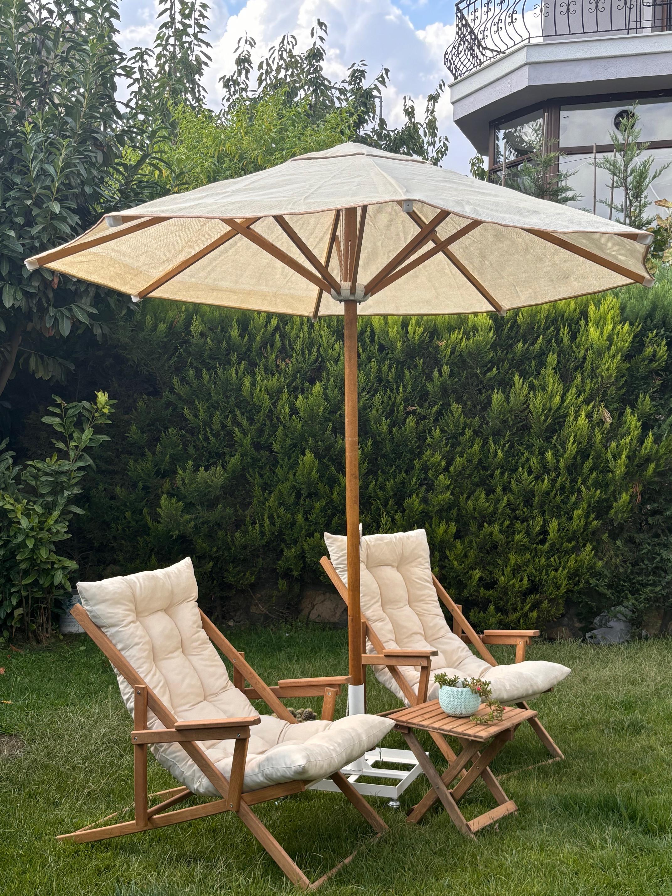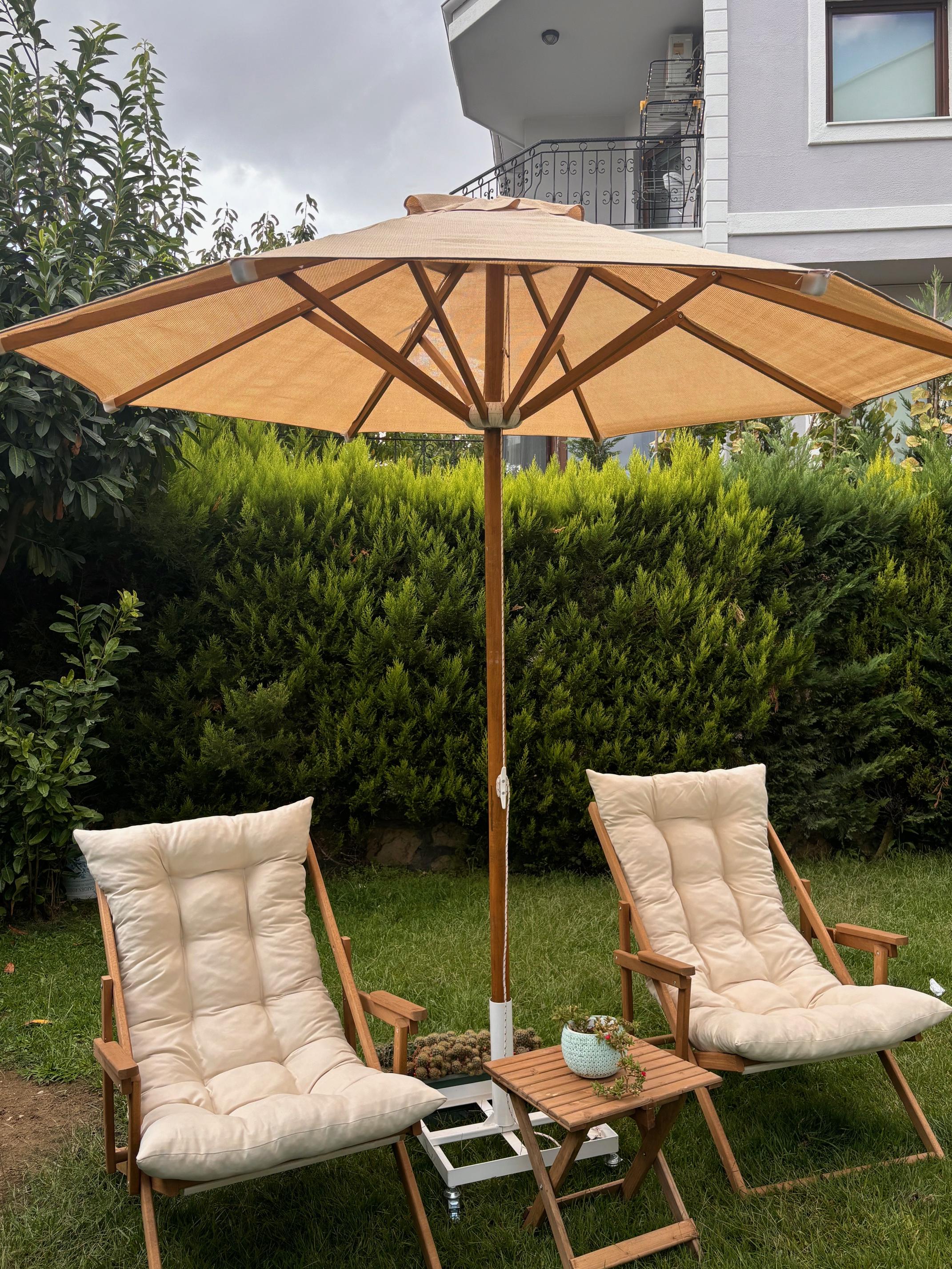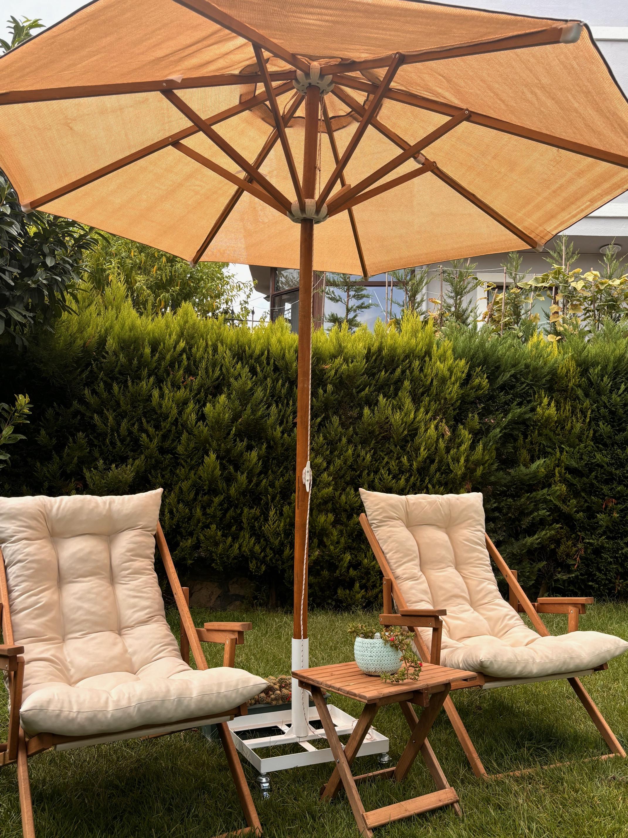 Görseldeki ahşap sandalyeler, sehpa ve şemsiye ayağı ( demir ayak ) fiyata dahil değildir.